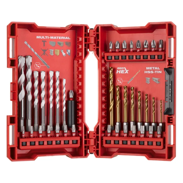 Poranterä- ja kärkisarja, joka sisältää 7 monimateriaalista poranterää, joiden koko on 10/8/6/5/4 mm, 8 Red Hex -titaaniporanterää, joiden koko on 6/5/4,5/4/3,5/3/2 mm sekä 23 iskunkestävää 25 mm poranterää, joiden koko on PH1/PH2/PZ1/PZ2/PZ3/TX10/TX15/TX20/TX25/TX30. Pakkauksessa on myös 60 mm magneettinen kärkipidike.