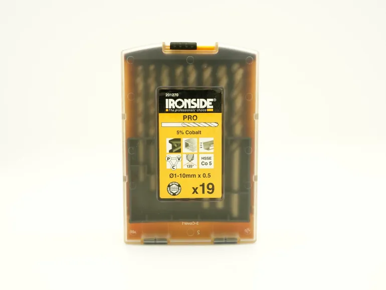 Muovilaatikko läpinäkyvällä kannella, 19 hiottua korkealaatuista pikateräsporaa. HSS 5% kobolttia. Korkea suorituskyky ja erittäin hyvä keskitys. Tarkkuusaloitus, ei tarvetta esiporaukselle. Tunkeutuu nopeasti ja vaatii vähemmän syöttöpainetta. Suunniteltu teräksen, seostetun ja seostamattoman teräksen, valuraudan, ei-rautametallien, muovin ja muiden materiaalien poraukseen. Ruostumattoman teräksen poraukseen käytetään pienempää nopeutta ja suurempaa syöttöpainetta ja mielellään jonkinlaista jäähdytystä.