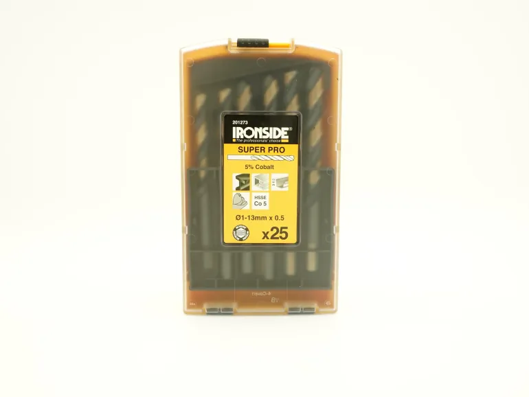 Muovilaatikko läpinäkyvällä kannella, 25 erikoishiottua korkealaatuista pikateräsporaa. HSS 5% kobolttia.