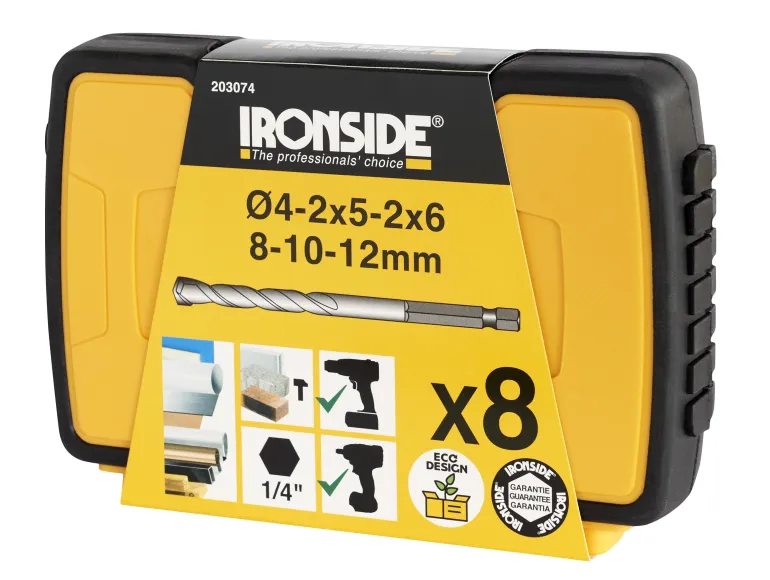 Ironside 203074 on laadukas poranteränsarja monien erilaisten materiaalien poraamiseen. Poranterä kovametallikärjellä lisää kestävyyttä ja monipuolisuutta monien eri materiaalien poraamiseen, kuten betoniin, tiileen, kattotiileihin, ohutmetalliin, keramiikkaan, tiileen, puuhun, PVC:hen, alumiiniin, kipsiin ym.