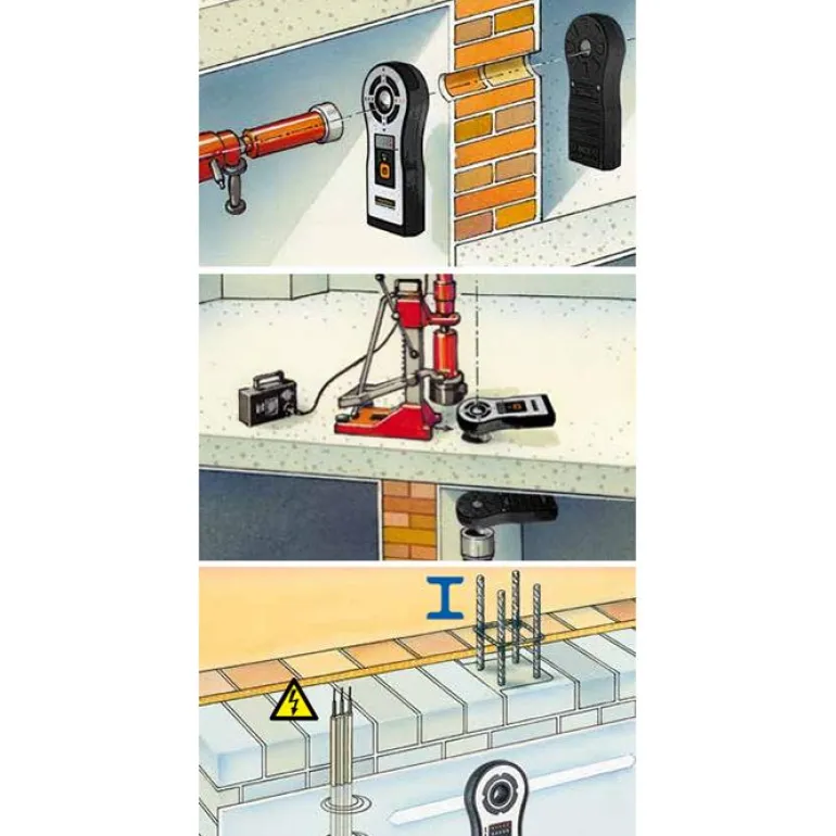 Porareiäntunnistin, jolla voidaan tarkasti määrittää sisään- ja ulostulokohdat porattaessa seiniin ja kattoihin. Center view lähettimessä tarkkaan asemointiin.