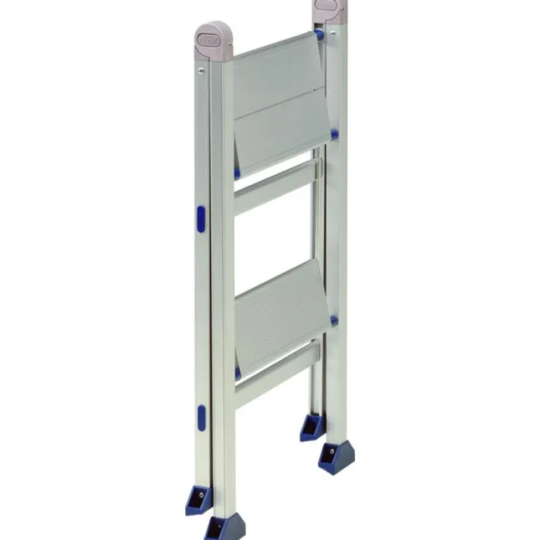 Kokoontaittuva kompakti porrasjakkara, anodisoitua alumiinia. Askelman syvyys 175 mm tai 115 mm.