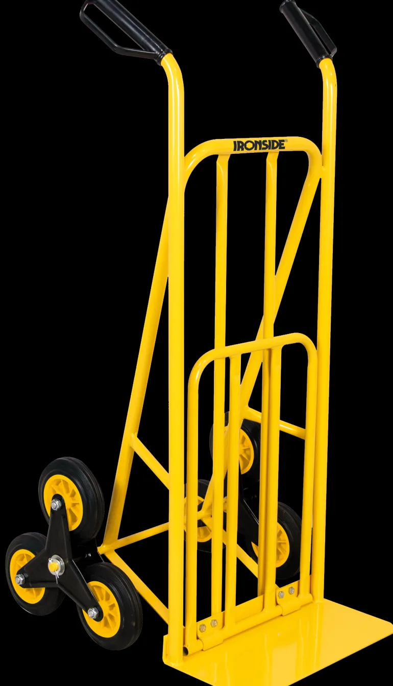 Porraskärry, jossa on kolme pyörää molemmilla puolilla, mikä helpottaa kuljetusta portaissa. Putkirakenne, jauhemaalattu. Haarukan mitat 425 x 205 mm ja kuormatason mitat 340 x 530 mm. Kapasiteetti maks. 150 kg.