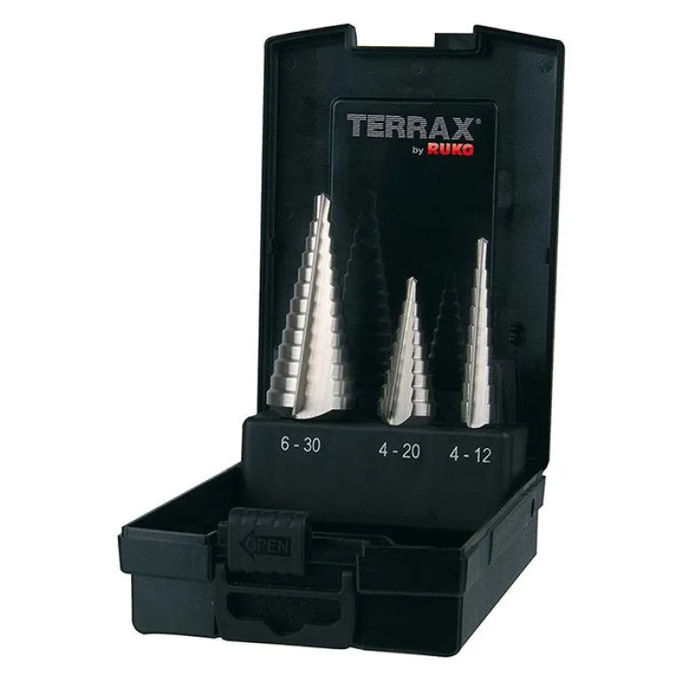 Korkealaatuinen Ruko A101126RO -porrasporanteräsarja sisältää kolme porrasporanterää, jotka sopivat kirjometalleille, termoplastisille materiaaleille ja lämpökovettuville muoveille sekä kaikille tavallisille teräslaatoille, joiden paksuus on enintään 4,0 mm. Toimitetaan kätevässä Terrax-laatikossa.