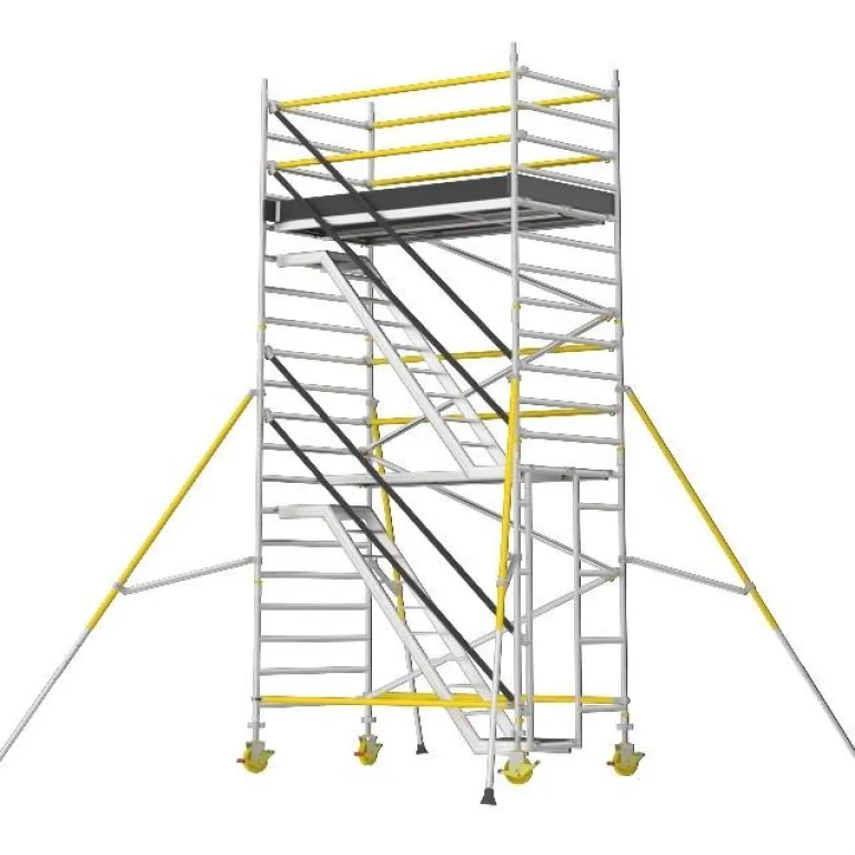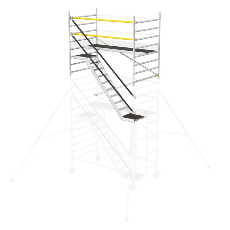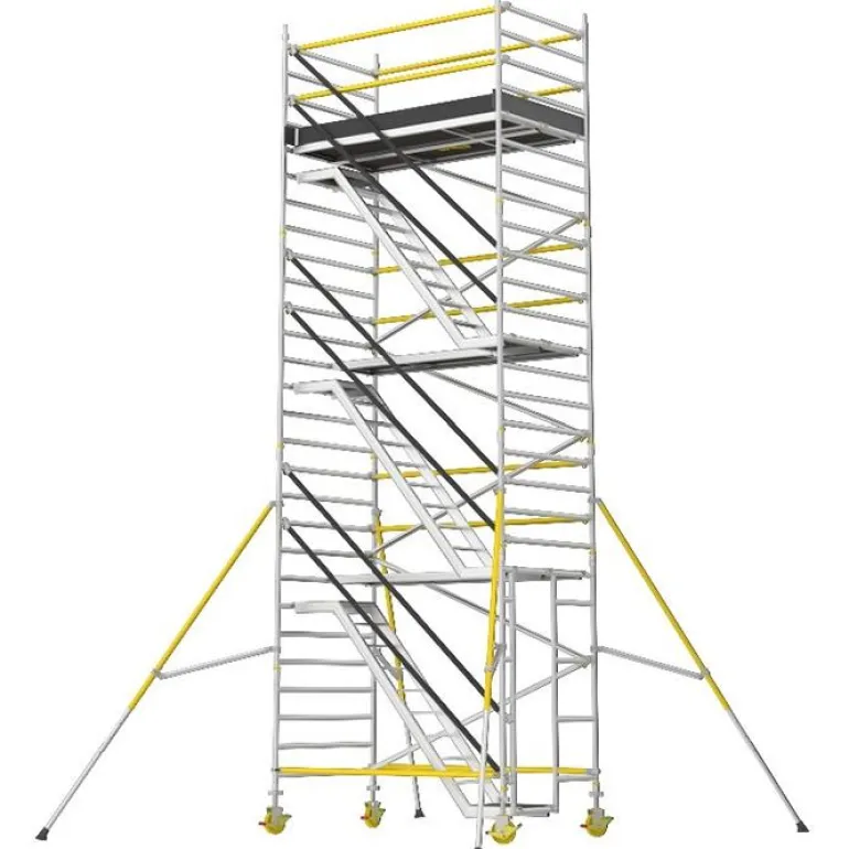 Erittäin tukeva ja helposti koottava porrasteline (tason korkeus 4,2 m), jossa on limittäiset tukisiteet antamassa turvallisemman työnteon korkeissa korkeuksissa. Täydellinen portaiden ja tasojen (kahden metrin välein), jalkalistojen, säädettävien pyörien (200 mm) ja tukijalkojen kanssa.