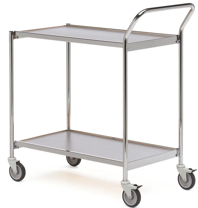 Vaunussa on 2 hyllyä ja ohjauskahva. Alusta kromia, harmaat tasot.