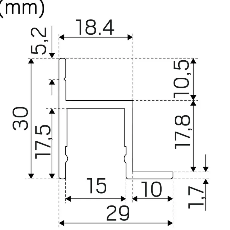 Alumiiniprofiili, jonka syvyys on 2000 mm, upotusasennettavaksi ja käytettäväksi sisätiloissa, märissä tiloissa ja ulkona.