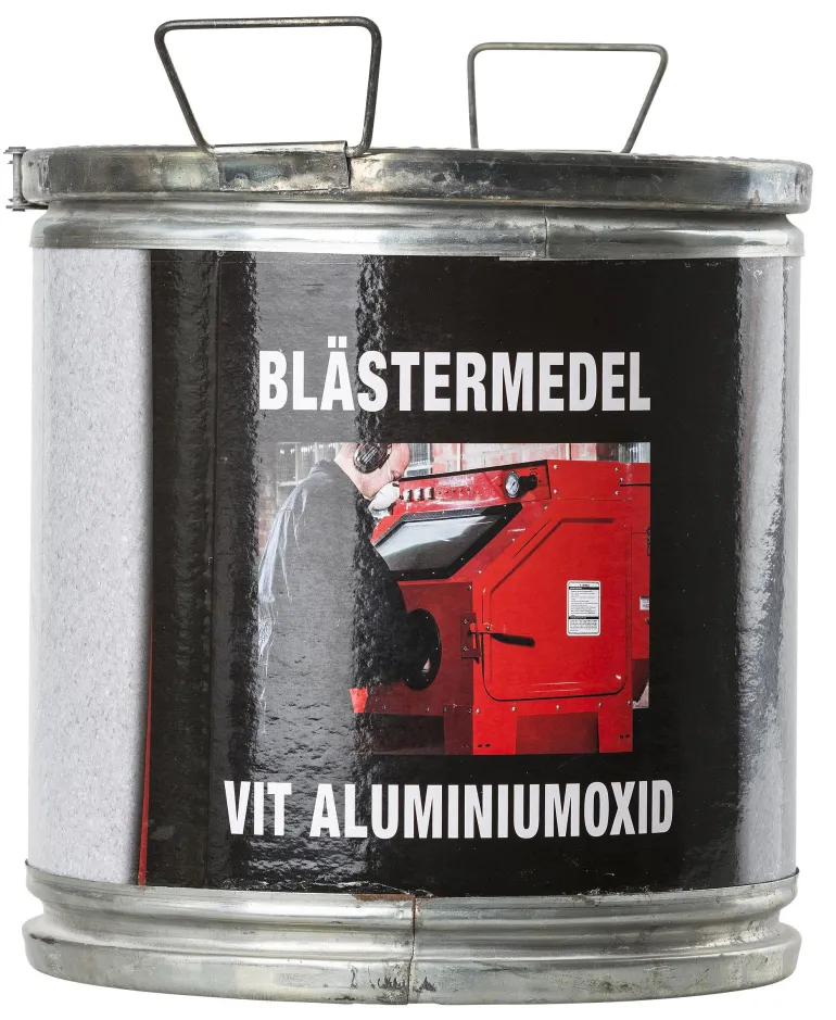 Pakkaus, joka sisältää 23 kg puhallusainetta jonka karkeus 0,50-1 mm. Valkoinen alumiinioksidi on kemiallisesti neutraali mineraalituote.