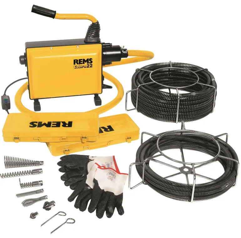 REMS Cobra 22 Set. Sähköinen putkenpuhdistuskone putkille Ø 20 – 150 mm. Koneessa on huoltovapaa hammashihnakäyttö, kondensaattorimoottori 230 V, 50 Hz, 750 W, suunnanvaihto, suojaletku. Henkilösuojakytkin (PRCD). 5 puhdistuskaapelin osaa 16 × 2,3 m kaapelikorissa, suora pora 16, nuijapora 16, sahalaitainen ristiteräinen lapiopora 16/25, liitostappi 16, 5 puhdistuskaapelin osaa 22 × 4,5 m kaapelikorissa, suora pora 22, palautuspora 22, suppilopora 22, sahalaitainen ristiteräinen lapiopora 22/35, liitostappi 22/32, 2 paria ohjainkäsineitä, teräspeltikotelo kullekin varaosasarjalle.