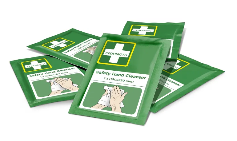Steriilejä puhdistuspyyhkeitä käsien tehokkaaseen puhdistukseen ja desinfiointiin (sisältää 70 % alkoholia).