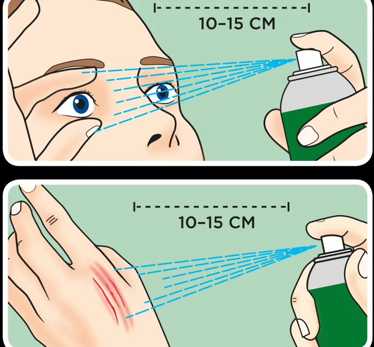 Puhdista suutin ennen käyttöä suihkauttamalla lyhyesti ilmaan. Suihkuta silmään tai haavaan 10–15 cm etäisyydeltä.