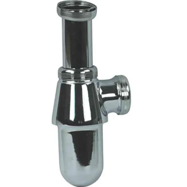 Metallinen pullovesilukko, jossa sivupoisto pesuallasta varten. Ilman putkea ja peitelaippaa.