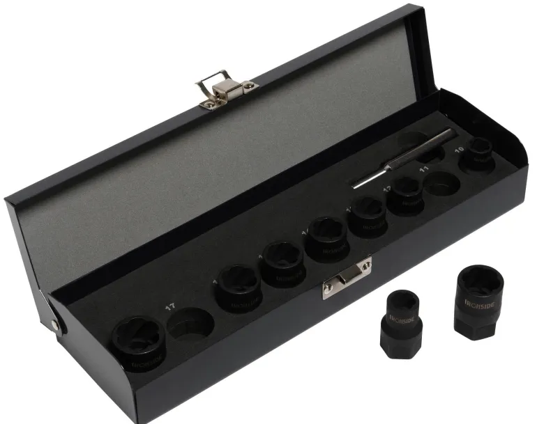 Pultin- ja ruuvinirrotinsarja, 10 osaa, rikkiruostuneiden tai pyöreäksi vääntyneiden pulttien ja muttereiden irrottamiseen. Voidaan käyttää myös useimmille lukkopulteille, joiden alkuperäinen työkalu puuttuu. Seostettua erikoistyökaluterästä. Kartiomaiset vasenkierteiset ja läpäisevät hylsyt soveltuvat käytettäväksi myös kierretankojen muttereille jne. 1/2″ – 10,11,12,13,14,15,16,17,19 mm ja irrotin. Toimitetaan käytännöllisessä peltikotelossa.
