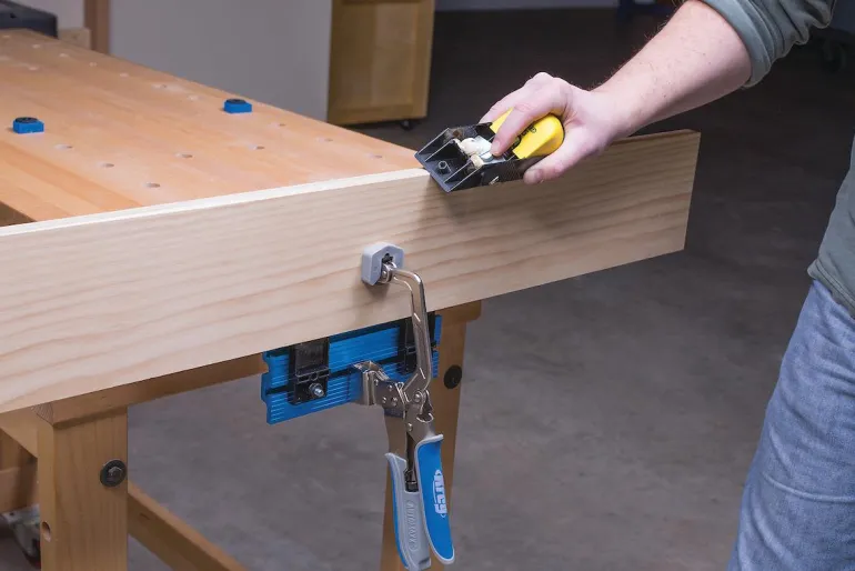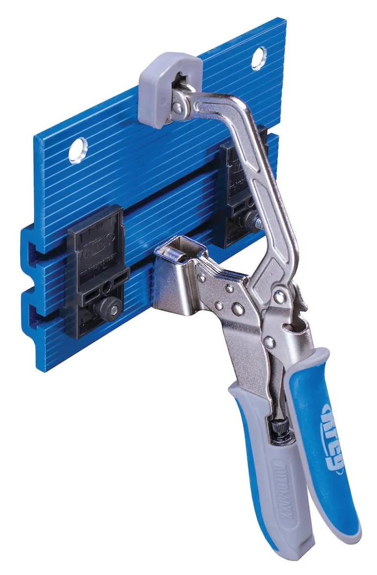 KREG KBC3-VISE yhdistää penkkipuristimen alumiinilevyyn, joka kiinnittyy työtason reunaan, jotta materiaalin kiinnittäminen onnistuu työpöydän sivulle. Automaxxin ansiosta puristin on säädetty siten, että se sopeutuu materiaaliin automaattisesti kahvan painalluksella.