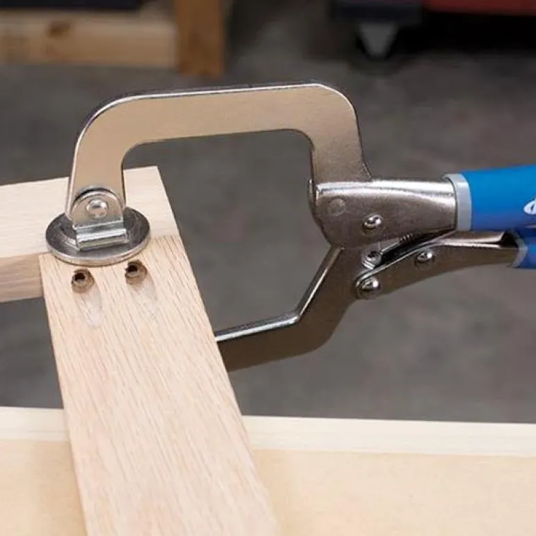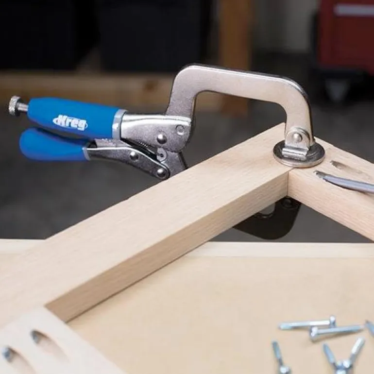 Puristin, jonka syvyys on 80 mm. Sovitettu erityisesti Kreg R3 -sovittimeen. Puristimen ulottuma on 76 mm, ja se soveltuu enintään 70 mm paksuiselle materiaalille.