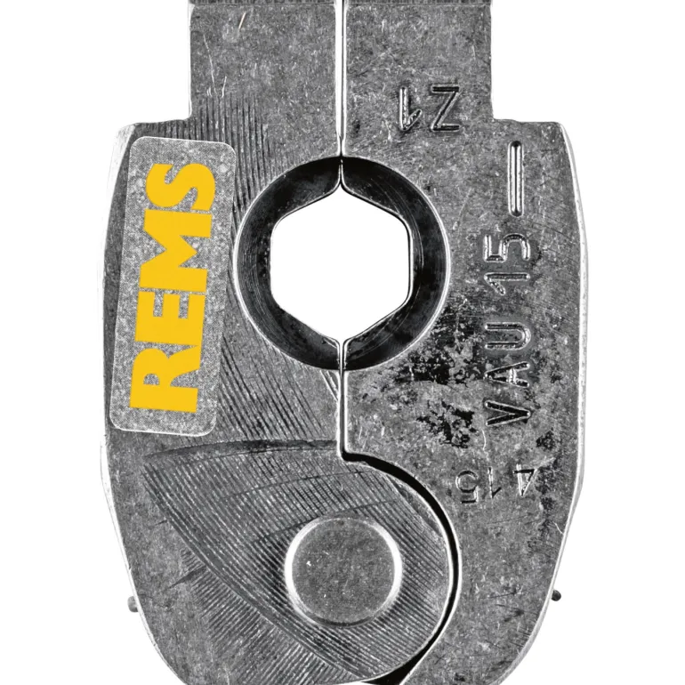 REMS 574540 R on puristusrengas VAU 15, 45° (PR-2B), jossa on 2 puristusleukaa puristusleukojen turvallista sijoittamista varten vaikeasti tavoitettaviin kohteisiin 45°:n kallistuksen ansiosta. Tarvitaan välipihdit Z1/Z1 Mini.