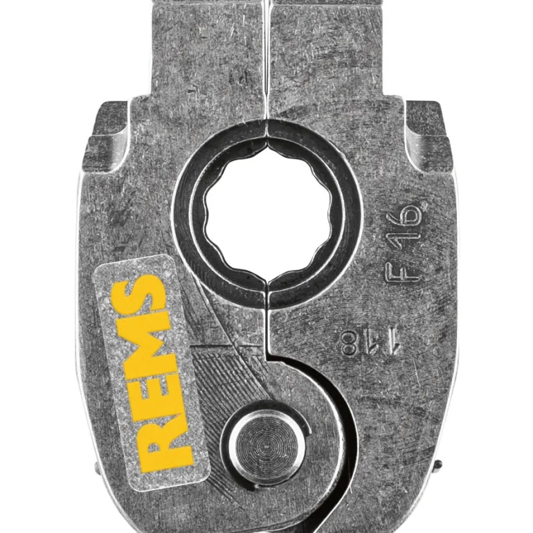 REMS 574550 R on puristusrengas F 16, 45° (PR-2B), jossa on 2 puristusleukaa puristusleukojen turvallista sijoittamista varten vaikeasti tavoitettaviin kohteisiin 45°:n kallistuksen ansiosta. Tarvitaan välipihdit Z1/Z1 Mini.