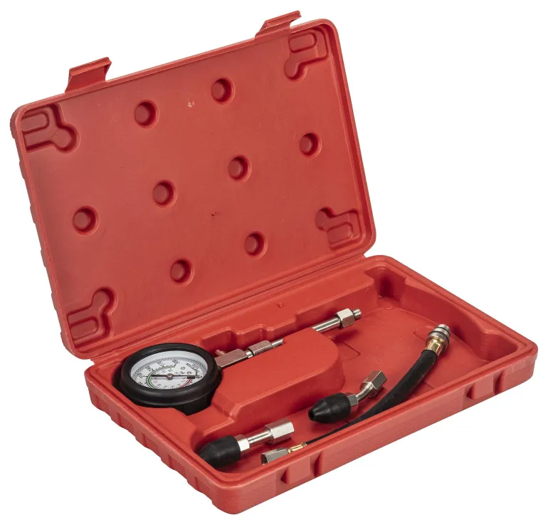 Pela 74264 on puristuspainemittari suoralla ja taivutetulla työntöliittimellä sekä letkulla, joissa kierteet M14 ja M18.