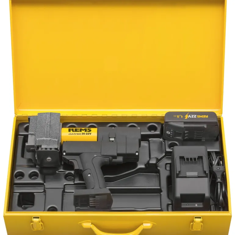 REMS Ax-Press 30 on 22V:n puristin paineholkkiliitosten valmistukseen puristusholkilla, Ø 12 – 32 mm. Sähköhydraulinen käyttö, tehokas akkukäyttöinen moottori, teho 380 W, kestävä planeettavaihteisto, epäkeskomäntäpumppu ja kompakti korkean hyötysuhteen hydrauliikkajärjestelmä.