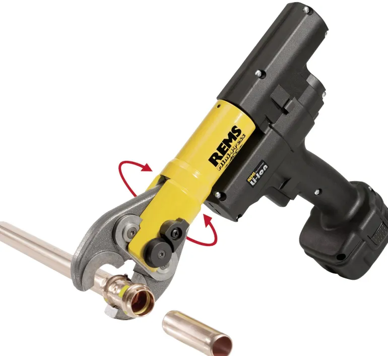 REMS Mini-Press on 14,4V:n akkukäyttöinen puristin, jossa on automaattinen sisäänveto puristusliitosten valmistukseen Ø 10 – 40 mm, Ø ⅜ – 1 ¼”. REMS-puristuspihtien käyttöön, Mini/puristusrenkaat. Kierrettävä puristustyökalun kiinnitys, automaattinen lukitus.