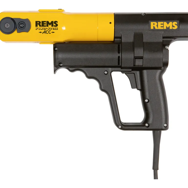 REMS Power-Press ACC on 230 V sähköhydraulinen puristin, jossa on automaattinen paluu, puristusliitosten valmistukseen Ø 10 – 54 (108) mm. REMS-puristuspihtien/puristusrenkaiden ja muiden valmistajien puristuspihtien/puristusrenkaiden käyttöön. Kierrettävä puristustyökalun kiinnitys, automaattinen lukitus.