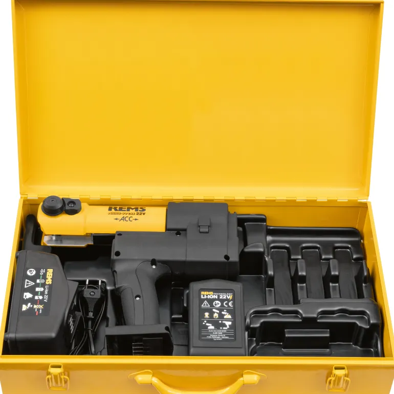 REMS Akku-Press 22 V ACC on 21,6 V:n puristin, teho 380 W, automaattinen palautus ja puristuspaineen valvonta, puristusliitosten valmistukseen Ø 10 – 108 (110) mm Ø 4″. REMS-puristusleukojen/puristusrenkaiden ja muiden valmistajien puristusleukojen/puristusrenkaiden käyttöön. Kierrettävä puristustyökalun kiinnitys, automaattinen säätö.