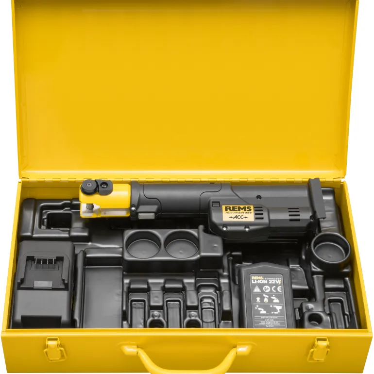 22 V:n sähköhydraulinen puristin, jossa on pistoolikahva ja automaattinen palautus, puristusliitosten valmistukseen Ø 10 – 40 mm, Ø ⅜ – 1 ¼”. REMS-puristuspihtien käyttöön Mini/puristusrenkaat, käännettävä puristuspihtien kiinnitys ja automaattinen lukitus.
