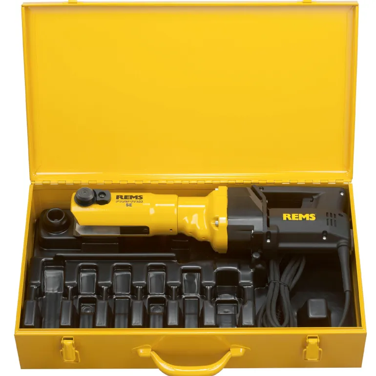 REMS Power-Press SE on 450W:n puristin putkiliittimien puristamiseen 10-54 mm. Varustettu yleiskiinnikkeellä useiden REMS-tyyppisten puristusleukojen käyttöön. Rothenberger, Geberit, LK jne. Puristuspihti lukittuu automaattisesti (täysin kiinni) ja antaa mahdollisuuden tarkistaa ja hyväksyä tuloksen ennen palautusta. Tehokas yleismoottori 400 wattia, 230 volttia 50-60Hz.