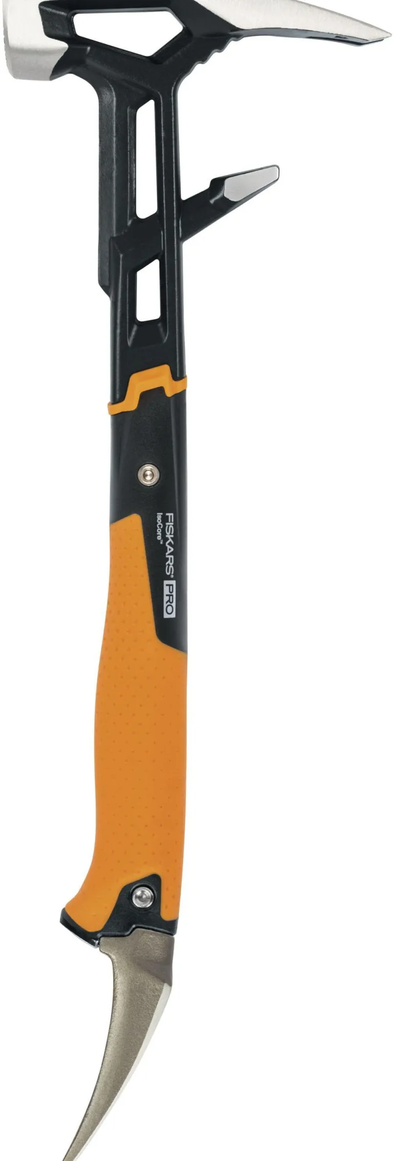 IsoCore-teknologia vähentää tärinää jopa 50 %. Haarat palkkien kiertämiseksi tai oikaisemiseksi. SoftGrip-kahva teksturoinnilla maksimaalisen pidon saavuttamiseksi. Talttapää ja väännin helpottavat laattojen poistamista. Demoreuna maksimoi iskuvoiman. Haara vetää naulan ulos.