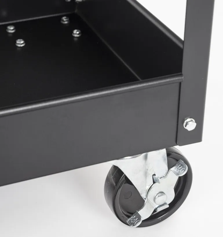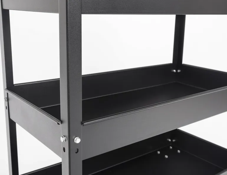 Työkaluvaunu soveltuu purkutasoksi. Vaunussa on kolme hyllyä ja neljä pyörää, joista kaksi on käännettävissä ja jarrullisia.