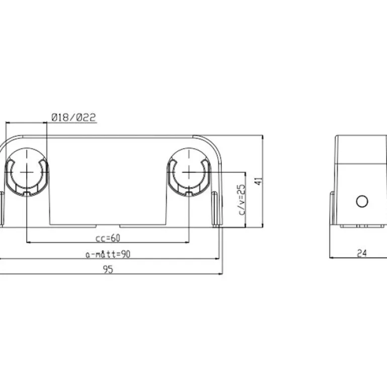 Kromattu kaksiosainen kiinnike ulkohalkaisijaltaan 18–22 mm:n putkille. C/C-etäisyys on 60 mm ja C/V-etäisyys 25 mm.