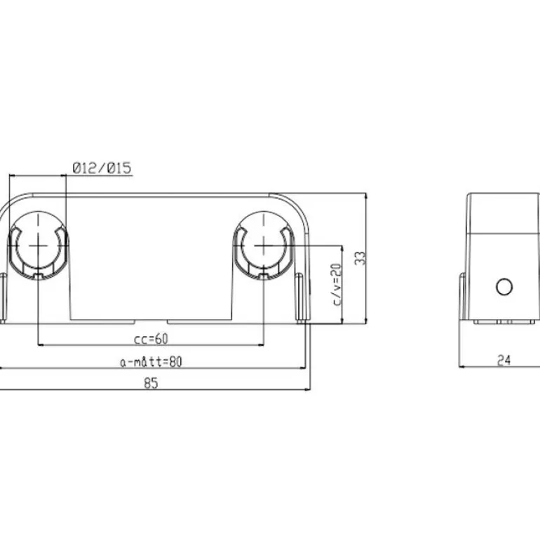 Kaksiosainen kromattu putkikiinnike ulkohalkaisijaltaan 12/15 mm:n putkille. C/C-etäisyys 60 mm.