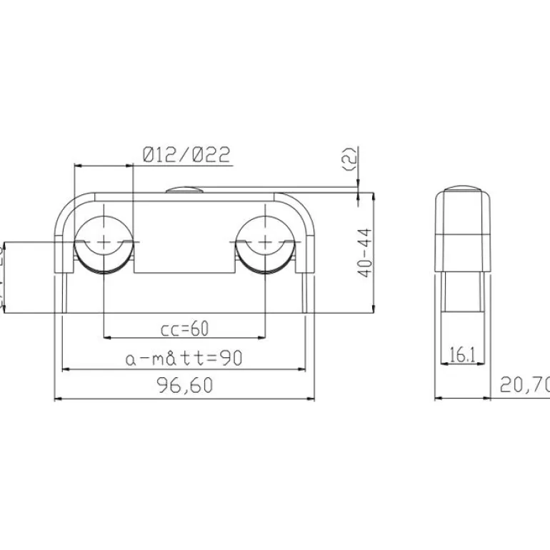 Valkoinen kaksiosainen kiinnike ulkohalkaisijaltaan 12–22 mm:n putkille. Puristimen C/C-etäisyys on 60 mm. Mukana toimitetaan suojatulppa ruuvinreikien peittämiseen.