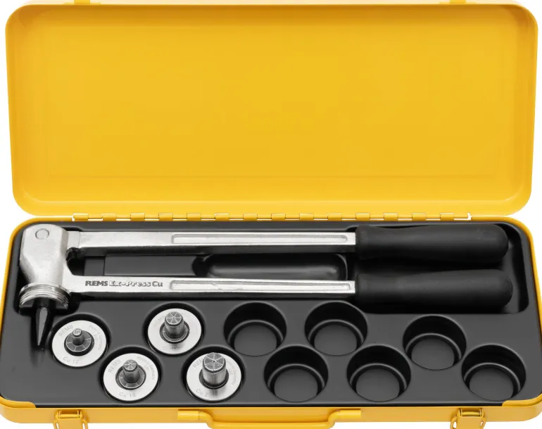 REMS Ex-Press Cu on laajennustyökalu putkien laajentamiseen ja kalibrointiin ilman liittimiä tehtävässä putkien asennuksessa. 6-osainen laajennustuurna takaa tasaisen pyöreän laajennuksen, erikoispitkä DVGW:n mukainen muhvi. Kalibrointipinnoilla varustetut laajennuspäät, jotka soveltuvat myös muille tuotemerkeille. Ei kuluja varusteista, varastoinnista tai hankinnoista; samalla säästyy juotospisteitä, juotosmateriaaleja ja työaikaa. Mahdollisuus tehdä muhvit putken ylijäämäkappaleista. Vääntöjäykät, voimaa välittävät laajennuspihdit, joissa on ergonomisesti muotoillut kahvat, mahdollistavat vaivattoman laajentamisen. Pitkä tuurnan ohjain, jousikuormitteinen tuurnan palautus. Sopii myös muiden valmistajien laajennuspäille. Helppo laajennuspään vaihto.