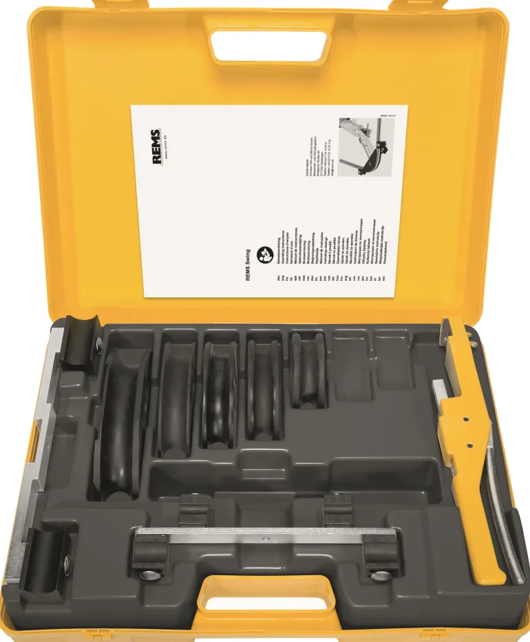REMS Swing Set on yhden käden putkentaivutin, mukana sarja 16 – 18 – 20 – 25/26 – 32 mm. Yleiskäyttöinen: saniteetti-, lämmitys-, ilmanvaihto-, jäähdytystekniikka ja hydrauliikka. Myös ohutseinämäisten putkien lämmitysputkien ja kuparista valmistettujen paneelilämmitysputkien käsittelyyn standardin EN 1057 mukaisesti sekä puristusmuhvijärjestelmiin.