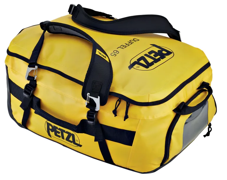 Keskikokoinen Petzl-kuljetuskassi. DUFFEL 65 on suunniteltu kannettavaksi monella eri tavalla. Se on mukava, ergonominen kassi, jonka tilavuus on 65 litraa. Pehmustetut selkä- ja olkahihnat ovat mukavat, kun kassia käytetään reppuna. Se on monipuolinen, koska sitä voidaan käyttää monin tavoin irrotettavien olkahihnojen ansiosta. Suuri aukko tarjoaa helpon pääsyn varusteisiin. Siinä on myös kaksi sisätaskua ja suuri sivutasku kypärälle tai kengille. Kassissa on neljä tukihihnaa, jotka optimoivat kassin tilavuuden ja estävät varusteiden liikkumisen kuljetuksen aikana. Suuri läpinäkyvä pinta mahdollistaa kassin nopean tunnistamisen. Se on valmistettu vahvasta TPU-pressumateriaalista, joka on tarkoitettu intensiiviseen käyttöön ja kestää UV-altistusta (ei haalistu), öljyä, rasvaa sekä korkeita ja matalia lämpötiloja ja joka on klooritonta (ei hajuja) ja kierrätettävää.