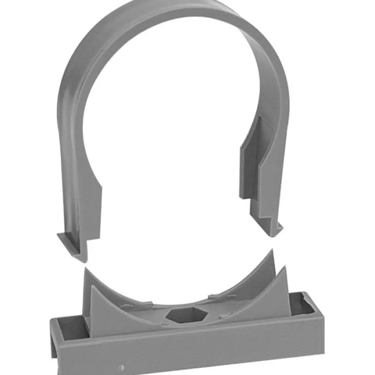 Harmaa putkikiinnike putkille, joiden ulkohalkaisija on 110 mm. Mitat 140 x 20 x 130 mm, valmistettu PP-muovista.