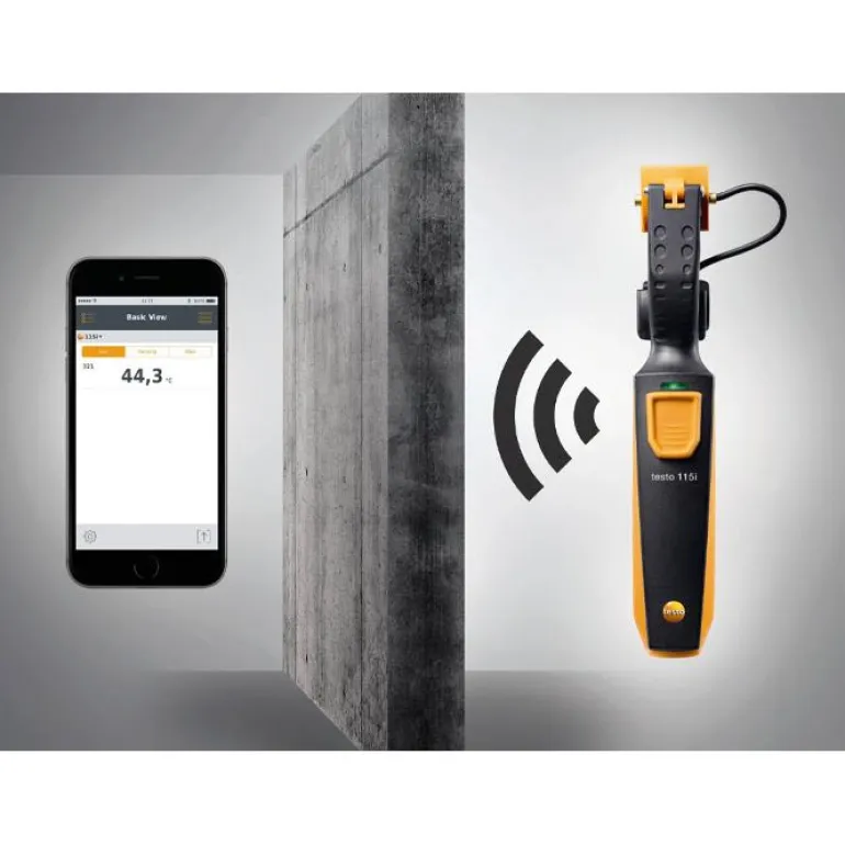 Älypuhelimeen tarvitaan Bluetooth-sovellus, joka on ladattavissa ilmaiseksi. Sitä käytetään sekä mittauksen ohjaamiseen että mittausarvojen lukemiseen. Lisäksi voit käyttää sovellusta mittausraporttien luomiseen, valokuvien ja kommenttien lisäämiseen sekä niiden lähettämiseen sähköpostitse. Sovellus on saatavilla sekä iOS:lle että Androidille. Yhteensopiva iOS 8.3:n tai uudemman ja Android 4.3:n tai uudemman kanssa. Kun mittauspaikat ovat kaukana toisistaan, testo 115 tekee työn paljon helpommaksi – langattoman yhteyden ansiosta. Kaikki mittaustiedot esitetään joko kaavion tai taulukon muodossa. Mittaustulokset voidaan lähettää suoraan PDF- tai Excel-tiedostoina.