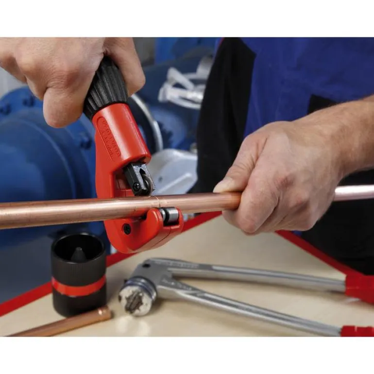 Putkileikkuri kupari-, messinki-, alumiini- ja teräsputkien katkaisuun. Läpimitoille 6–35 mm. Toimintasäde 123 mm.