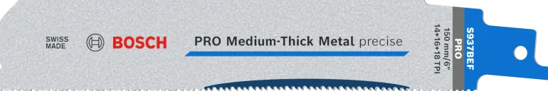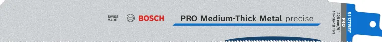 Bosch Professional PRO Medium-Thick Metal Precise S937BEF puukkosahanterä, jonka kovat terät on liitetty joustavaan runkoon hitsaamalla bimetallia. Vankkatekoinen, paksu, hyvää, suoraa leikkuujälkeä tuottava terä. Sopii kaikkiin S-varrellisiin puukkosahoihin. Pitkä käyttöikä leikattaessa metalliputkia ja -profiileja, joissa on keskipaksut seinämät. Sopii metalliputkille ja -profiile sekä ei-rautametalleille.