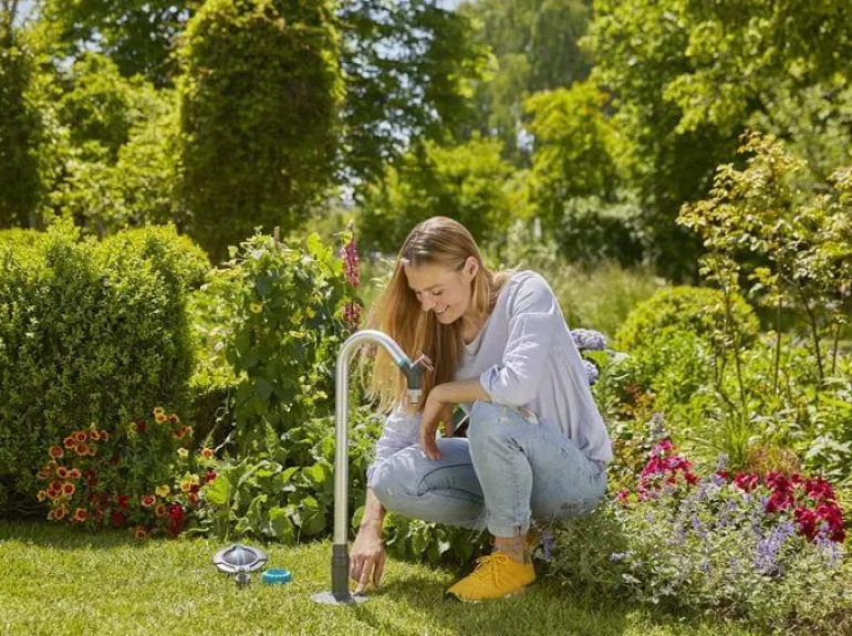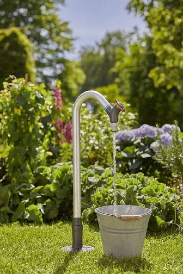 Korotetun hanan korkeus on optimaalinen, mikä tekee sen käytöstä mukavaa. Voit kääntää puutarhahanaa haluttuun suuntaan ja muuttaa veden virtausnopeutta säätöventtiilin avulla. Veden virtaus voidaan myös sulkea kokonaan venttiiliä hyödyntäen. Anti-Splash-ominaisuuden ansiosta vesi ei roiski kastelukannua tai ämpäriä täytettäessä, vaikka hanaan ei olisi liitetty letkua.