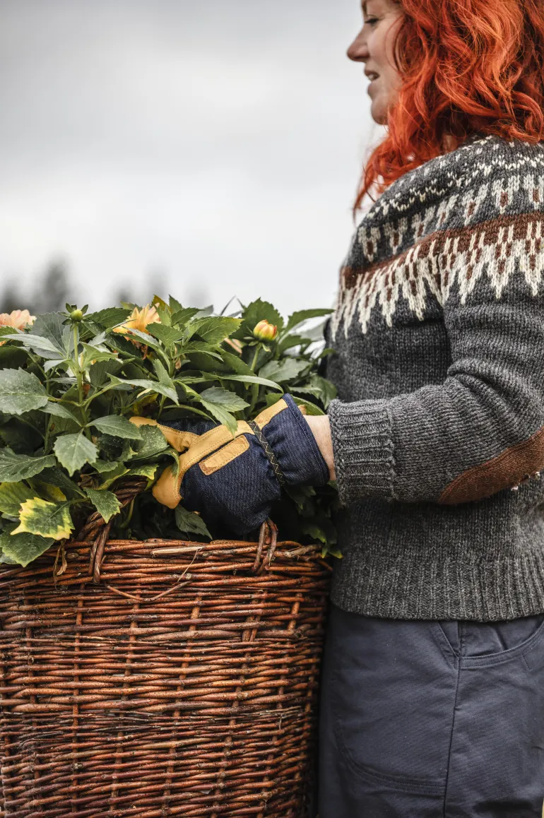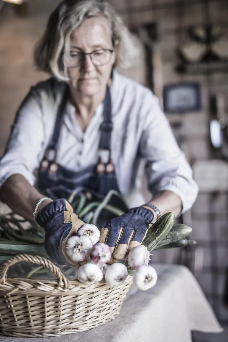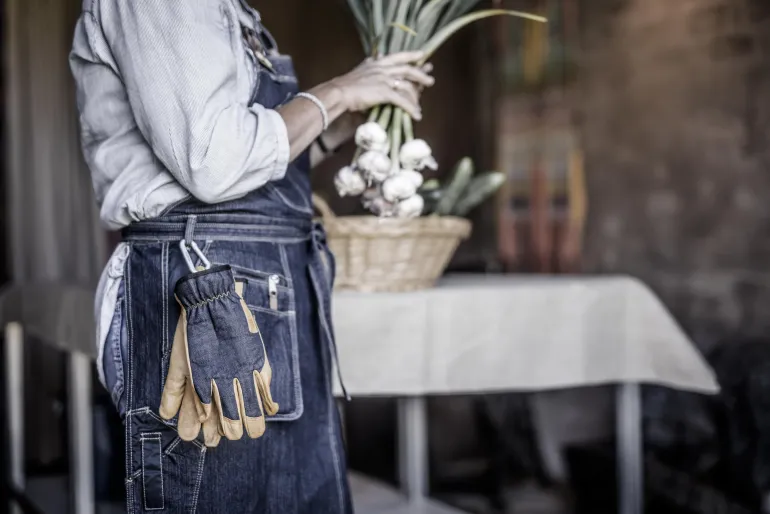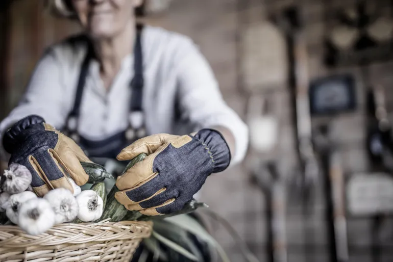 Monipuolinen ja joustava käsine puutarhanhoitoon. Käsine on tehty vuohennahasta ja siinä on vahvistetut sormet ja farkkupäällinen.