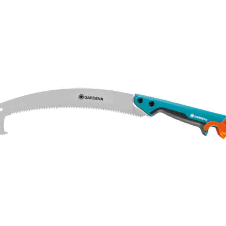 GARDENA 300 PP on kaareva Combisystem-puutarhasaha, jossa on 340 mm pitkä sahanterä, jota voidaan käyttää joustavasti käyttöpaikan mukaan. Jos haluat sahata helposti tavoitettavia oksia, käytä puutarhasahaa normaalina käsisahana. Saha istuu mukavasti käteen ergonomisen kahvan ansiosta, jonka muoviosat ovat mukavan pehmeitä. Jos haluat leikata oksia jopa viiden metrin korkeudelta, pidennä puutarhasahaa yksinkertaisesti Combisystem-teleskooppivarren avulla. Kätevää: kiinnitä Combisystem-varsi sahaan. Turvalukon ansiosta liitäntä pysyy varmasti kiinni. Tarkkuushammastus; impulssikarkaistut hampaat kärjet ja kaksinkertainen hionta takaavat turvallisen sahaamisen.