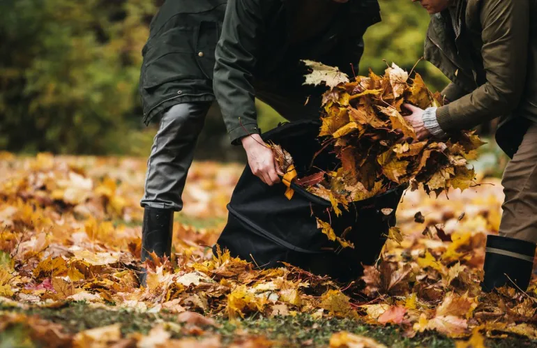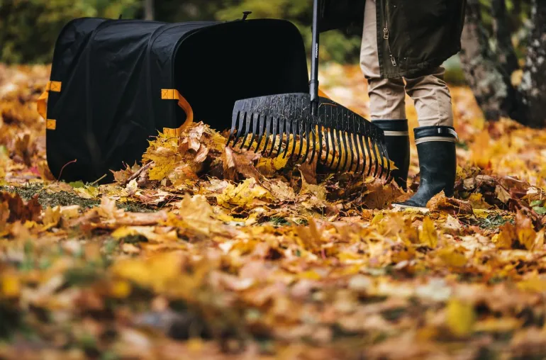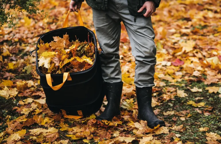 Kokoontaitettavaan neliönmuotoiseen puutarhasäkkiin on helppo haravoida lehdet suoraan tarvitsematta nostaa niitä. Kätevä pop-up -puutarhasäkki puutarhajätteelle.