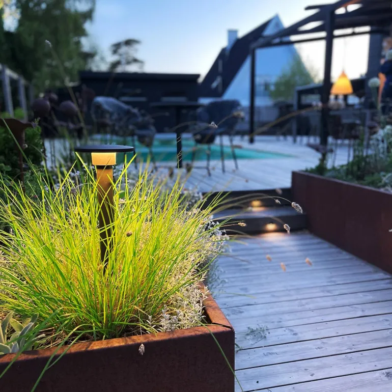 LightsOn Garden Plug & Play on joustava ja hinnaltaan kilpailukykyinen 12 voltin (turvallinen matalavirta) puutarhavalaistusjärjestelmä, jonka voit asentaa helposti itse ja laajentaa myöhemmin jopa 50 metrin kokonaispituuteen. Valaisimissa on lämmin valo ja skandinaavinen muotoilu – suunniteltu kestämään pohjoisen ilmastoa. Muista valita muuntaja, joka vastaa valaisimiesi yhteenlaskettua wattilukua. Parhaan käyttöiän saavuttamiseksi suositellaan, ettei muuntajaa kuormiteta yli 85 % sen maksimikapasiteetista. Voit myös lisätä valojärjestelmään hämäräkytkimen, joka sytyttää valot automaattisesti illan hämärtyessä. Orbit on yhteensopiva 5094 himmentimen kanssa, joka kytketään ennen valaisinta.