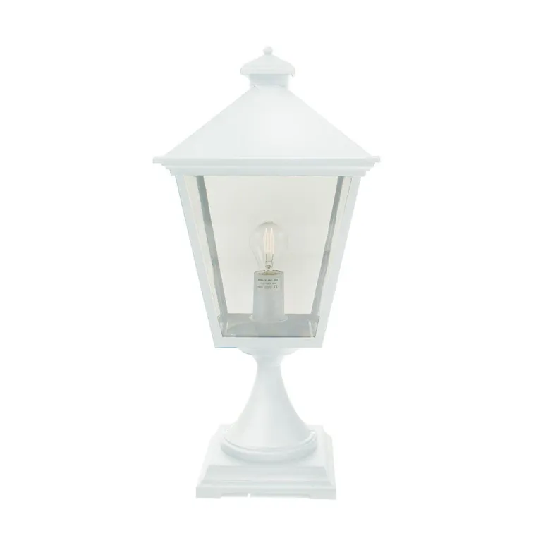 Pylväsvalaisin, jonka valaisin ja pylväs ovat valettua ja jauhemaalattua alumiinia. Polykarbonaattilasi. Nelikulmainen pohja 20 cm. Pultinreikien välinen etäisyys on 9 cm.