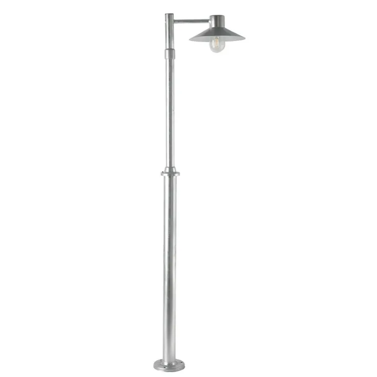 Teräksinen pylväsvalaisin kirkkaalla lasilla. Valaisimessa on E27-kanta ja säädettävä korkeus välillä 1700–2380 mm.