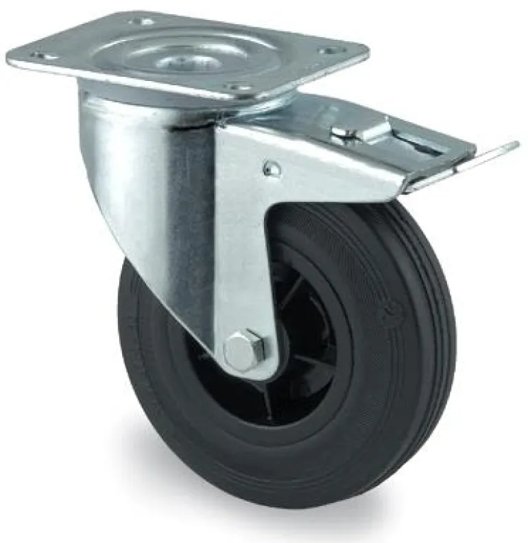 Teollisuuspyörässä on musta kumipinta ja rullalaakerointi. Pidike on valmistettu galvanoidusta teräslevystä, kaksinkertaiset kääntyvät nostolaakerit, joissa on likaantumista estävä tiivistesuojaus. Kaksitoiminen jarrutoiminto, jossa lukitus kohdistuu pyörään ja laakeriin.