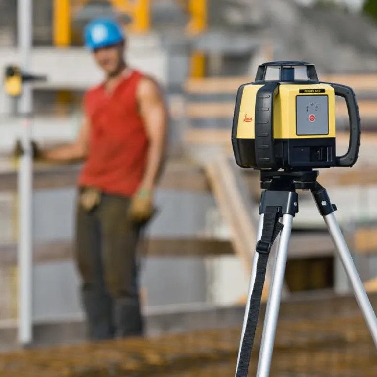 Leica Rugby 610 on pyörivä laser vaakatasoiseen vaaitukseen, näkyvä lasersäde. Rugby 610:ssä on vain yksi painike. Kun laite käynnistetään, se asettuu automaattisesti vaakatasoon.