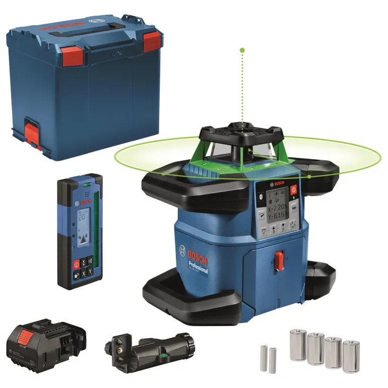 Pitkäkestoinen työskentely on varmistettu kahdella eri virtalähdemahdollisuudella. Voit käyttää joko Boschin ladattavaa 18 V:n Li-ion-akkua tai alkali-D-kennoparistoja. Optimaalinen käyttömukavuus ylivertaisten ominaisuuksien, kuten näytön, kaksoiskallistuksen, kaltevuusmuistin ja korkealaatuisen vastaanottimen (LR 65 G Professional) ansiosta.